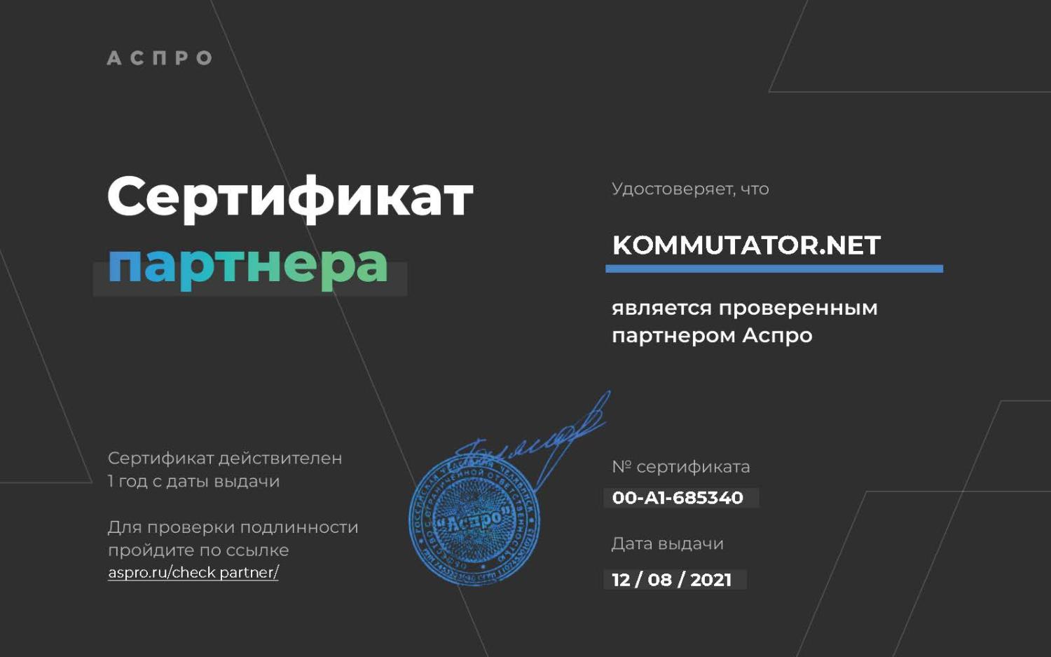 Сертификат партнёра АСПРО