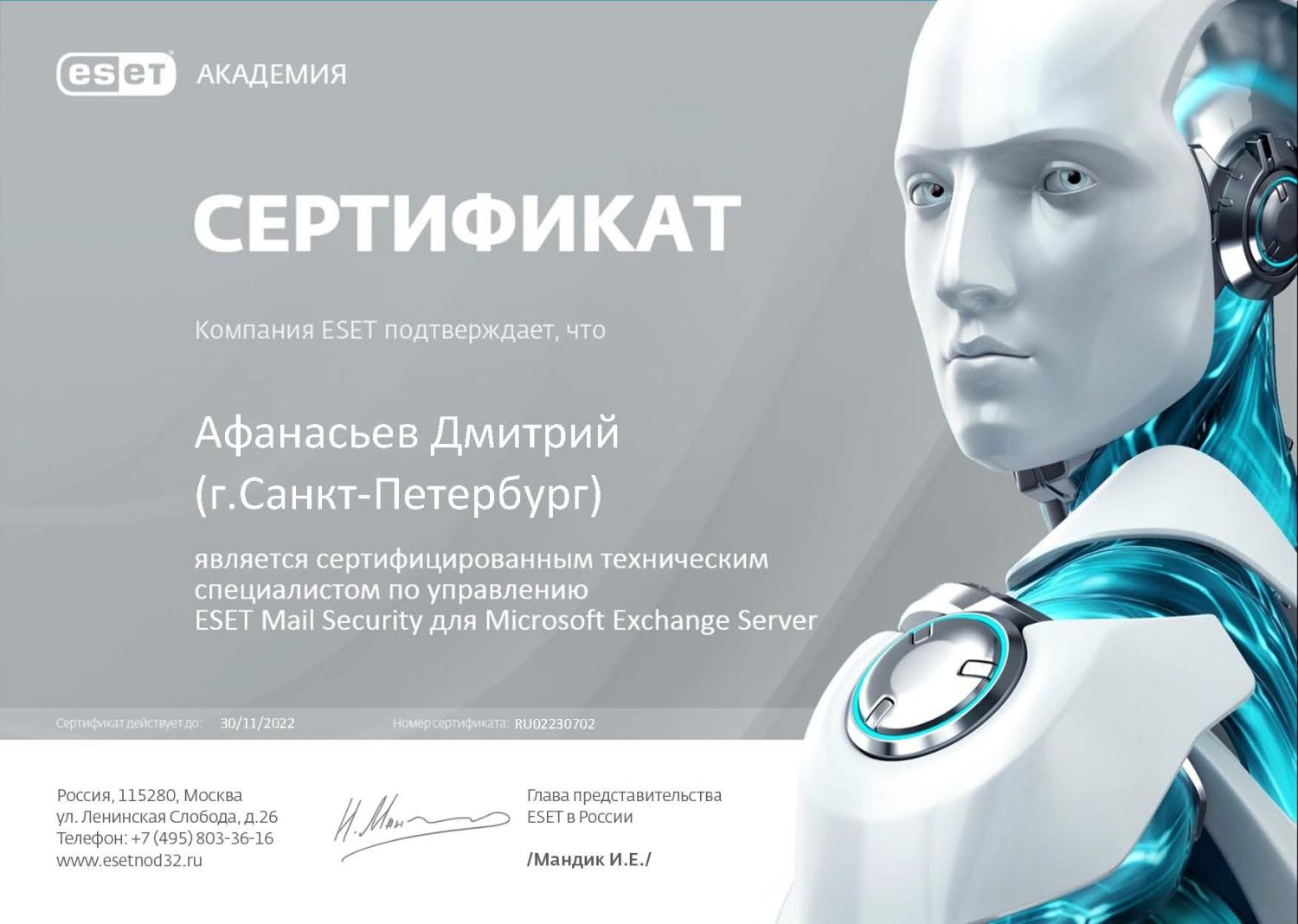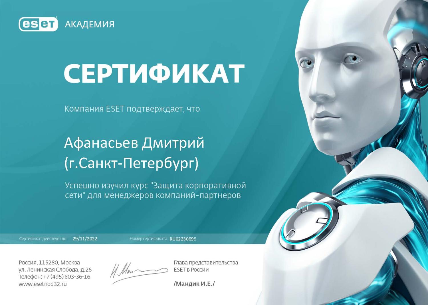 Сертифицированный специалист по управлению антивирусными решениями ESET (9-е поколение)